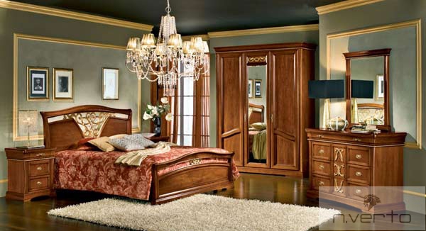 Спальня «Beatrice» Выполнена по всем канонам классического стиля из массива, полностью отделана шпоном ореха. Особый шик модели придают расписаные под золото вставки и возможность выбора нескольких вариантов кроватей.