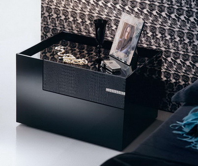 Отделка предметов гарнитура – комода, прикроватных тумб, искусственной кожей под крокодила, практически неотличимой от настоящей, придает дополнительный шарм и очарование этой мебели. В спальне Даймонд любой человек ощущает себя владыкой окружающего его маленького мира, залитого отраженным светом, царем природы и повелителем времени. Жизнеутверждающий, оптимистичный дизайн спального гарнитура хорошо подойдет целеустремленным, уверенным в себе людям, не терзающимися сомнениями по поводу правильности выбранного жизненного пути. представлены дизайнерами фабрики в исполнении, идентичном кровати.