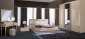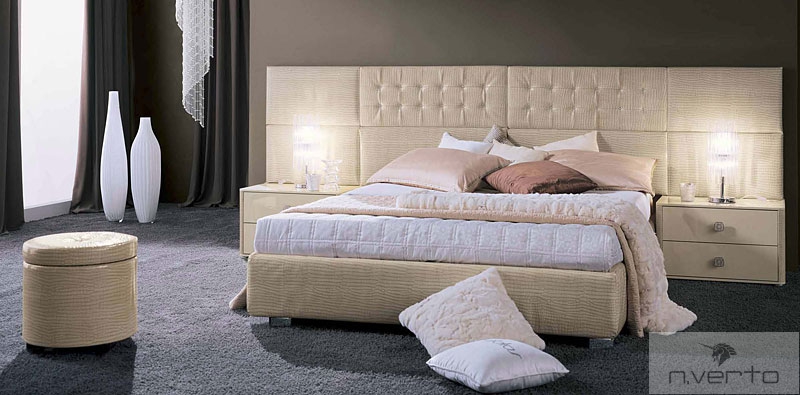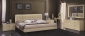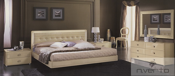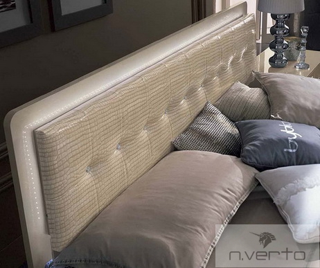 Cпальня изготавливается в отделке бежевым лаком и лакированой экокожей, стилизованой под кожу каймана. Светодиодная подсветка кровати снизу даёт эффект "парящего ринга". Кровать также может комплектоваться ящиком для белья, при этом периметр кровати изготавливается мягким в отделке из экокожи. Изголовье кровати стандартно имеет светодиодную подсветку. Изголовье может быть 2-х видов: дерево с отделкой бежевым лаком или с мягкой частью из экокожи, украшеное стразами "Сваровски", и лакированым периметром. Концептуально новое изголовье "Moon" состоит из нескольких модульных панелей. Количество и тип панелей можно выбрать индивидуально. Возможно украшение такого изголовья стразами "Сваровски". Данное изголовье выполняется в мягкой обивке из лакированой экокожи, очень приятной на ощупь.
