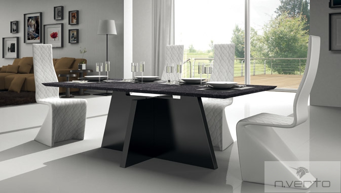 Cтол «Milos» итальянской фабрики «IdealSedia» .  Фабрика «IdealSedia» знаменита во многих странах мира благодаря широкому ассортименту качественной мебели и аксессуаров. Фабрика специализируется на изготовлении обеденных зон из стекла, металла, дерева, пластика и других материалов. В качестве обивки для столешниц и посадочных мест стульев используется ткань, кожа, экокожа различных цветовых решений.